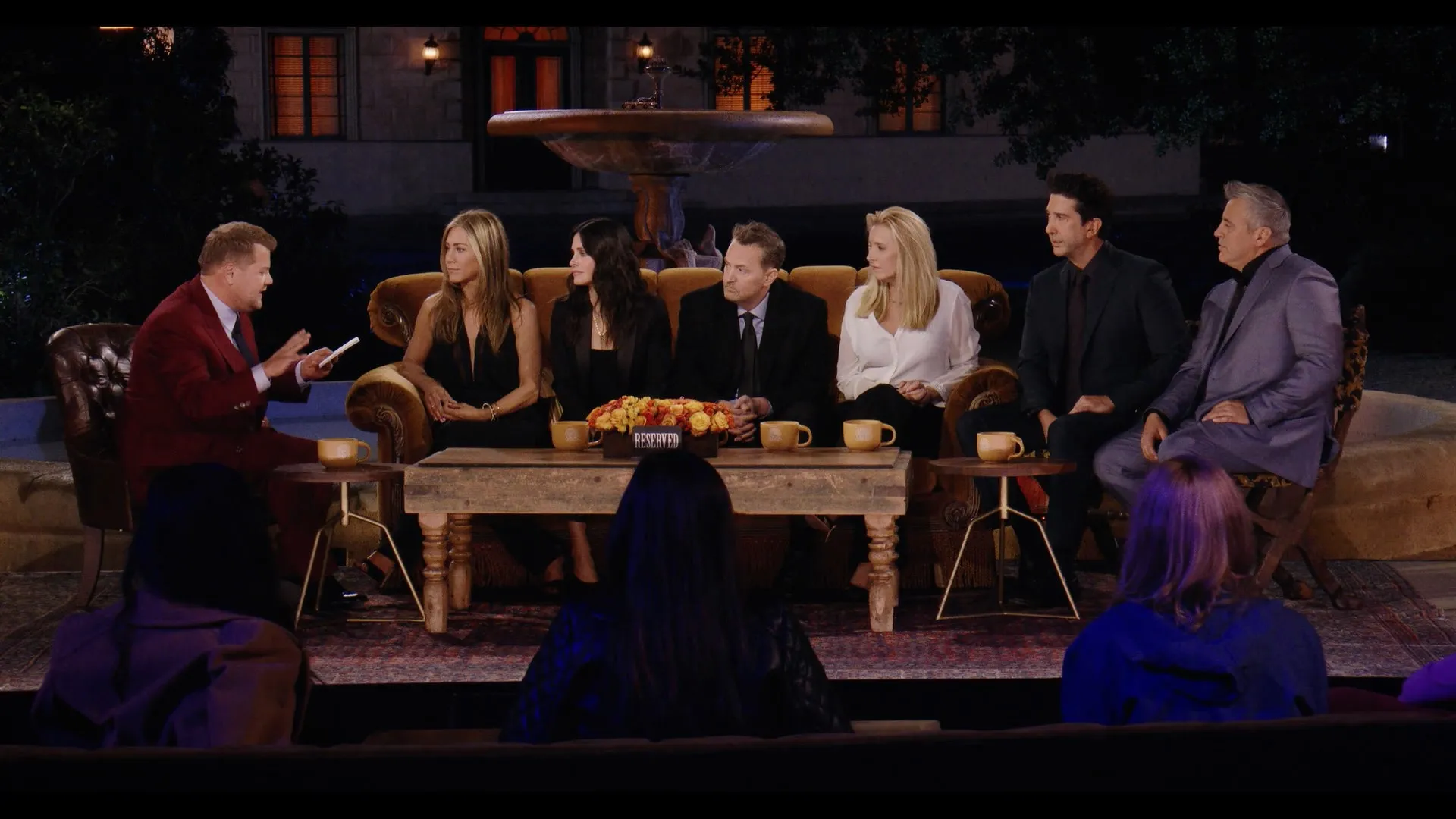 Cast: Jennifer Aniston as Self, Courteney Cox as Self, Lisa Kudrow as Self, David Schwimmer as Self, Matt LeBlanc as Self, Matthew Perry as Self, James Corden as Self - Moderator, Maggie Wheeler as Self, Tom Selleck as Self, Elliott Gould as Self, Christina Pickles as Self, James Michael Tyler as Self, Larry Hankin as Self, Thomas Lennon as Self, Reese Witherspoon as Self, David Beckham as Self, Lady Gaga as Self, Mindy Kaling as Self, Kit Harington as Self, Malala Yousafzai as Self, Justin Bieber as Self, Cara Delevingne as Self, Cindy Crawford as Self, Paul Rudd as (archive footage), Danny DeVito as (archive footage), Ben Stiller as (archive footage), Julia Roberts as (archive footage), Brad Pitt as (archive footage), Sean Penn as (archive footage), Kim Tae-hyung as Self, Kim Seok-jin as Self, Park Ji-min as Self, Min Yoon-gi as Self, Kim Nam-joon as Self, Jeon Jung-kook as Self, Jung Ho-seok as Self